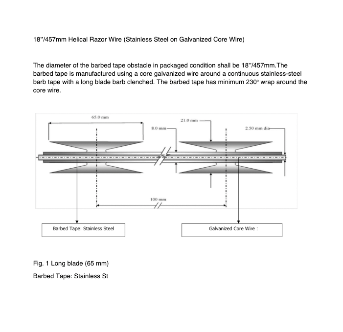 The Standard Razor Ribbon is 18” helical, 33 loops, 50’ yield, 430 stainless steel blades, galvanized core wire, and 098” 3” O.C. barb cluster spacing.
